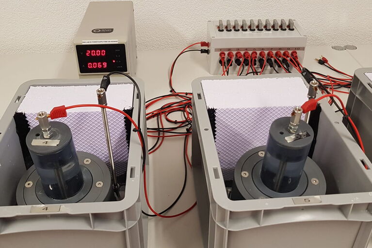 Il secondo tipo di corrosione delle armature è indotta dai cloruri. La resistenza ai cloruri indica la velocità con cui gli ioni cloruro possono penetrare nel calcestruzzo. Durante l’analisi in conformità con la norma SIA 262/1, Appendice B, la velocità di penetrazione degli ioni cloruro nel calcestruzzo viene determinata entro pochi giorni. Il metodo si basa su un'accelerazione della diffusione dei cloruri mediante un campo elettrico.